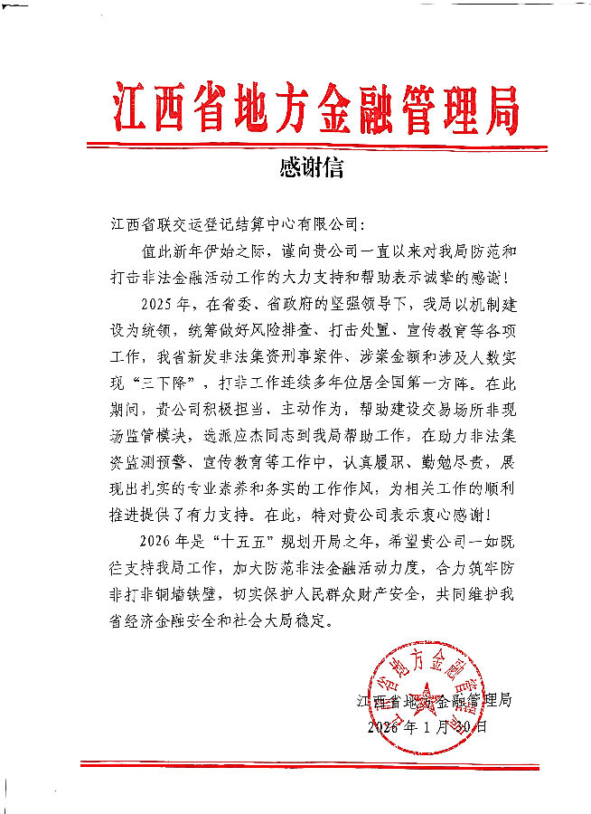 公司連續(xù)多年收到中國(guó)物流與采購(gòu)聯(lián)合會(huì)大宗商品流通分會(huì)和江西省地方金融管理局發(fā)來(lái)的感謝信,既是肯定也是勉勵(lì)。我們將繼續(xù)聚焦“走在前、勇爭(zhēng)先、善作為”的目標(biāo)要求,緊扣我省“防風(fēng)險(xiǎn)、強(qiáng)監(jiān)管、促高質(zhì)量發(fā)展”地方金融管理工作主線,在圍繞中心、服務(wù)大局中有效發(fā)揮地方金融基礎(chǔ)設(shè)施平臺(tái)職能作用,加快加大金融科技與監(jiān)管科技在地方金融領(lǐng)域的創(chuàng)新實(shí)踐步伐,為促進(jìn)地方金融行業(yè)穩(wěn)定與發(fā)展作出新的的更大貢獻(xiàn)。