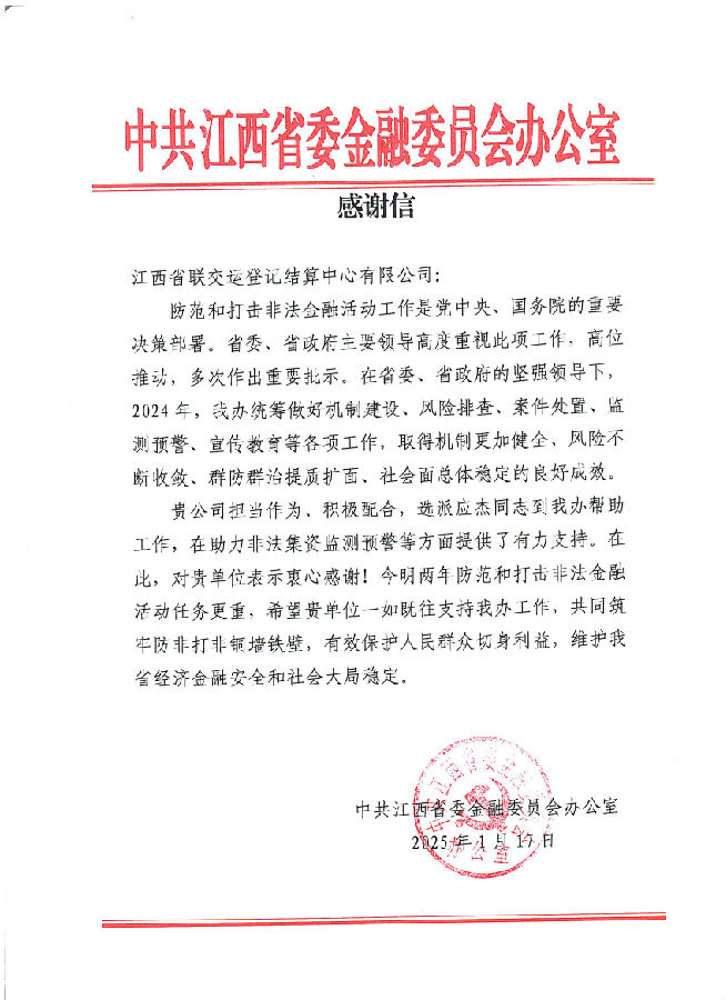 近日,江西聯(lián)交運連續(xù)收到來自中共江西省委金融委員會辦公室和中國物流與采購聯(lián)合會大宗商品流通分會發(fā)來的感謝信,分別對公司多年以來持續(xù)服務并建設(shè)運營好“贛金鷹眼”江西省非法集資監(jiān)測預警平臺,助力我省防范和處置非法集資監(jiān)測預警以及在培育大宗商品新質(zhì)生產(chǎn)力、推進供應鏈創(chuàng)新與應用等方面做出的積極貢獻表示表達肯定和感謝。