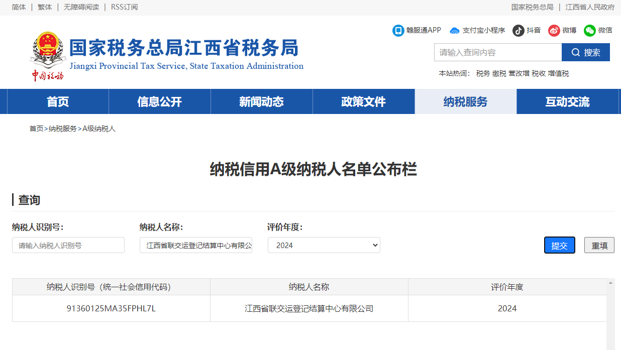 近期,國家稅務總局江西省稅務局公布了2024年度納稅信用A級納稅人名單,公司連續(xù)4年獲評“納稅信用A級納稅人”稱號。