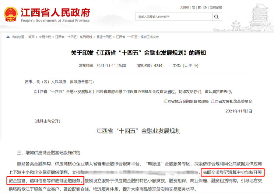 2021年11月3日,《江西省“十四五”金融業(yè)發(fā)展規(guī)劃》印發(fā),指出要牢牢把握服務(wù)實(shí)體經(jīng)濟(jì)、防控金融風(fēng)險(xiǎn)、深化金融改革三大任務(wù),大力發(fā)展科技金融、供應(yīng)鏈金融,支持江西省聯(lián)交運(yùn)登記結(jié)算中心創(chuàng)新開展資金監(jiān)管、信用信息等供應(yīng)鏈金融服務(wù)。公司迅速響應(yīng)落實(shí)《規(guī)劃》指導(dǎo)要求,積極發(fā)揮地方金融基礎(chǔ)設(shè)施作用,創(chuàng)新發(fā)展集中登記結(jié)算管理的服務(wù)內(nèi)容和場(chǎng)景應(yīng)用,推出了資金Ta管家產(chǎn)品。