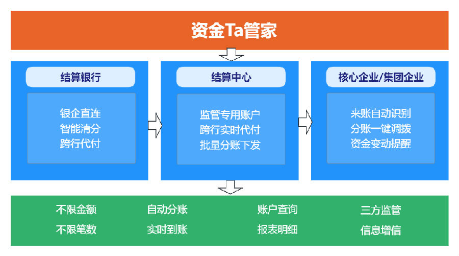 資金Ta管家產(chǎn)品是公司基于省級(jí)登記結(jié)算中心職能和優(yōu)勢(shì),在結(jié)算銀行開設(shè)資金結(jié)算管理專戶,為各類具有集中批量資金結(jié)算管理需求的供應(yīng)鏈核心企業(yè)、集團(tuán)企業(yè)等提供監(jiān)管專用賬戶、跨行實(shí)時(shí)代付、批量分賬下發(fā)等全流程資金結(jié)算管理服務(wù)。