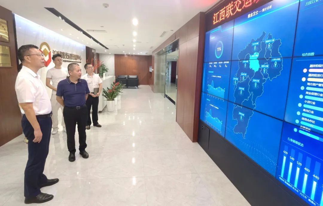 劉祖國(guó)一行首先觀摩了江蘇小貸行業(yè)綜合信息系統(tǒng)展示大屏,詳細(xì)了解江蘇省小貸行業(yè)數(shù)字化監(jiān)管、發(fā)展和運(yùn)行等情況。