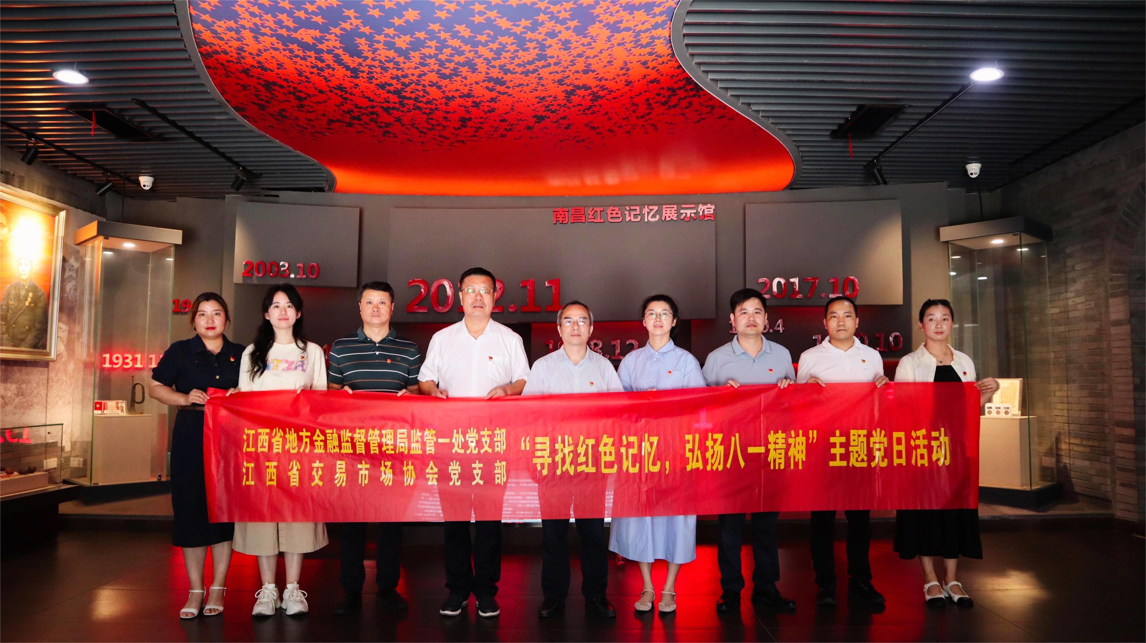 為熱烈慶祝中國(guó)人民解放軍建軍96周年,繼承弘揚(yáng)紅色革命基因,8月2日,江西省交易市場(chǎng)協(xié)會(huì)黨支部與省金融局監(jiān)管一處黨支部聯(lián)合開展“尋找紅色記憶 弘揚(yáng)八一精神”主題黨日活動(dòng)。省金融局監(jiān)管一處黨支部書記李四旺同志、協(xié)會(huì)執(zhí)行會(huì)長(zhǎng)劉祖國(guó)同志參加活動(dòng)。